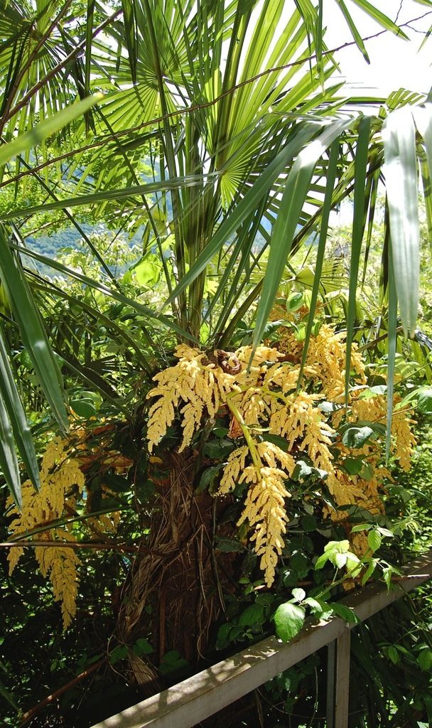 Arrivo sul posto e effettivamente una Vipera aspis sonnecchia sul fiore di una palma. Ok, l’albero è cresciuto nel dirupo che costeggia la strada, e il fiore si situa a circa un metro e mezzo dal livello della strada. In più probabilmente la vipera ha sfruttato le ringhiera, passando dalla strada alla pianta sfruttando la vegetazione che collega strada-corrimano-albero.